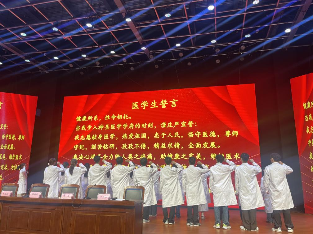 典礼的高潮环节,在院团总支书记汪珊的带领下,全体2025级新生高举右拳,进行了庄严的医学生誓言的宣誓。铿锵有力的誓言回荡在会场,彰显了新一代医药学子献身医学、服务人民的坚定信念。