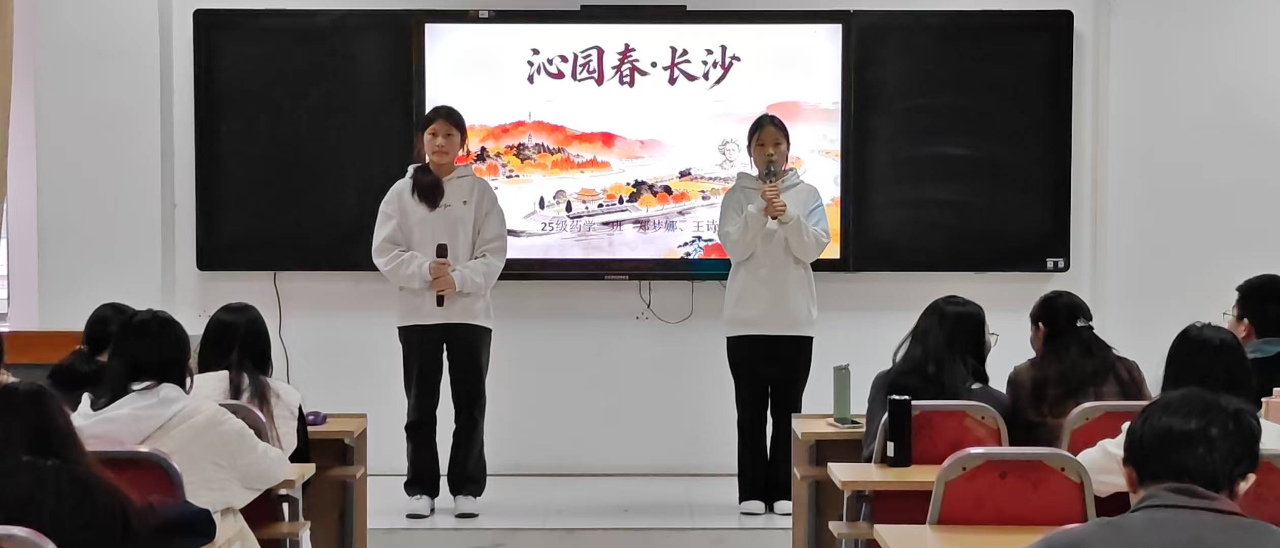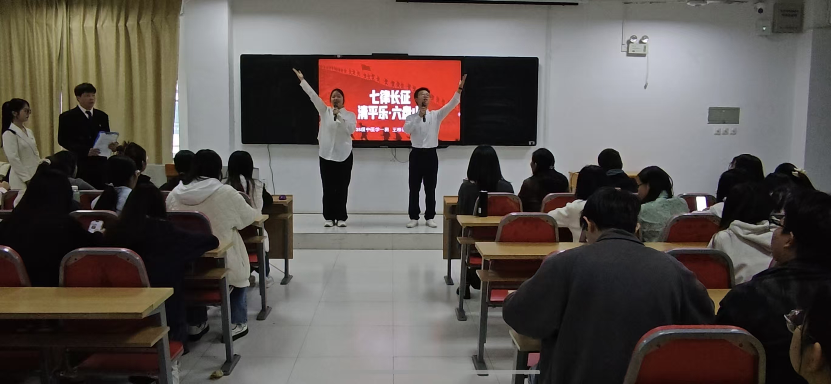 为弘扬中华优秀传统文化,缅怀革命先烈,赓续红色基因,2026年4月2日,中医药学院学工党支部在8301多媒体教室隆重举行“我们的节日·清明”革命诗词朗诵比赛。学院党总支书记陈才、学工党支部党员及辅导员代表出席活动并担任评委。经过初赛选拔,共有8支参赛队伍脱颖而出,进入最终对决。